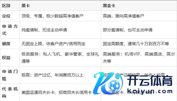 4. 转头 黑卡: 主要指宇宙顶级信用卡,如好意思国运通百夫长黑金卡。门槛极高,仅限顶级富豪和超高净值客户,做事极致奢华。 黑金卡: 是高端信用卡之一,门槛略低,定位为高净值东谈主群,提供高端权利和做事。 通俗来说,黑卡的级别高于黑金卡开云体育,代表更尊贵的身份瑰丽。 |