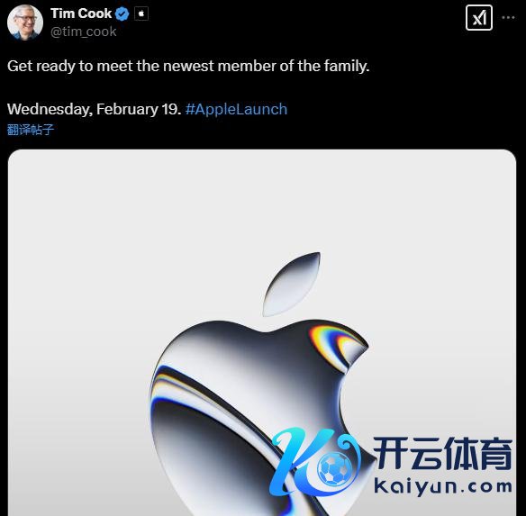 北京时分周五(2 月 14 日)零点附近,苹果 CEO 蒂姆 · 库克在鄙俗媒体发布了一段 7 秒的视频,配文称"准备好管待家庭的新成员"。 视频是一段苹果金属 logo 的短动画,库克写说念" 2 月 19 日,星期三 #AppleLaunch "。这意味着,苹果公司届时将公布至少一款新的家具,但库克莫得提供其他细节。