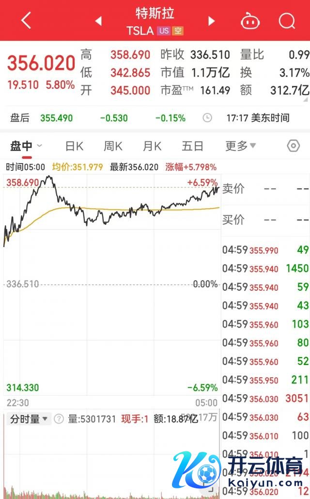 特斯拉报 356.02 好意思元,涨 5.80%,市值通宵增多 625 亿好意思元(约合东说念主民币 4556 亿元)。