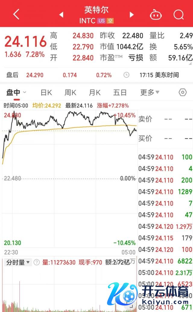 英特尔报 24.116 好意思元,涨 7.28%,市值 1044.2 亿好意思元,续创 2024 年 12 月以来收盘新高。