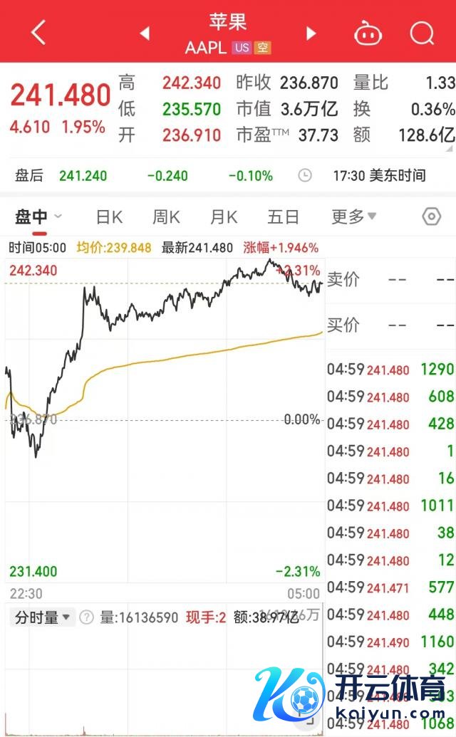 苹果股价报 241.48 好意思元,涨 1.95%,市值 3.6 万亿好意思元。