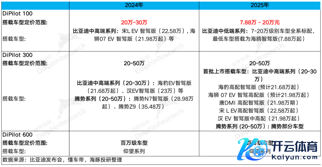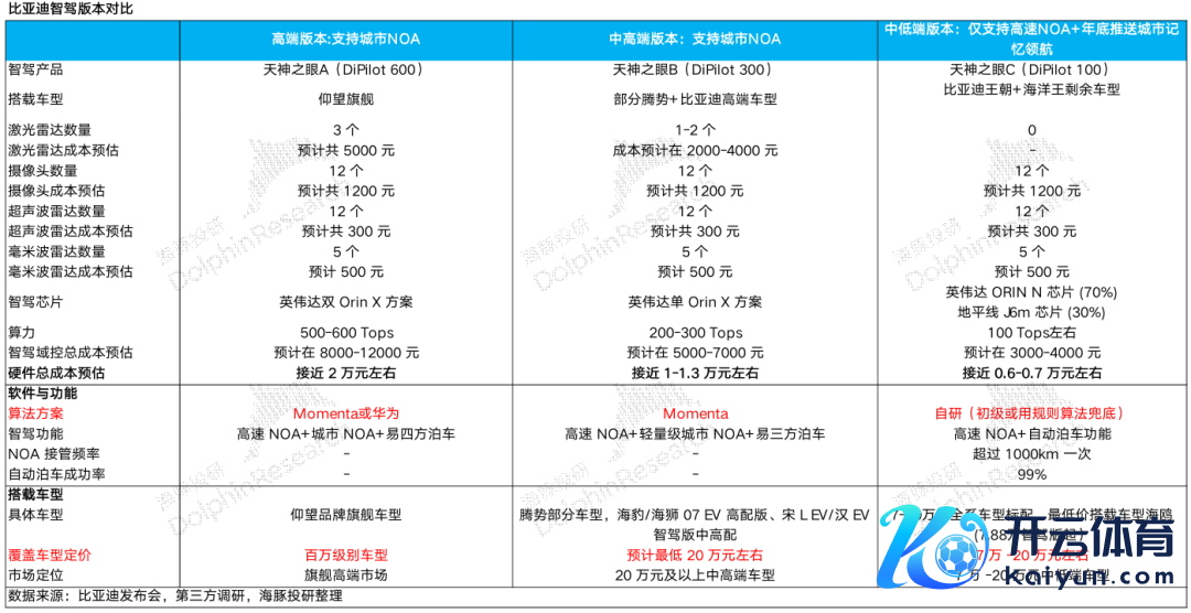 2025年2月10日,比亚迪正如昨年5月发布的“DM 5.0”技能,聚焦于”电比油低“(混动续航大幅进步,油耗大幅裁减)带给行业的回荡一样,又再次掀翻了“智驾平权”的新一代波涛,具体发布会纪要详见《比亚迪(纪要):智驾平权时期驾临》。 而在发布会召开的次日,比亚迪股份(1211.HK)收跌0.7%,似乎在评释资金一定程度上依然提前订价此轮智驾预期, 但戒指2月19号,比亚迪比较于智驾发布会召开前又收涨了10.7%。 刚好,海豚君就接着这次比亚迪“智驾平权”为中枢的发布会,来看一下比亚迪的智能驾驶布局,尝试通晓以下几个中枢问题: 1. 比亚迪智驾平权的含金量若何? 2. 这次比亚迪发布会落地决策是否超阛阓预期? 3. 比亚迪“智驾平权”策略的意旨在那边? 以下是详实分析 1. 比亚迪智驾平权的含金量若何? 分析含金量若何,咱们先望望比亚迪智驾的决策和硬软件建立齐有哪些: ① 比亚迪智驾的建立和搭载车型齐有哪些? 从这次发布会信息来看,比亚迪天使之眼分为A/B/C三个版块: 1)最高端:天使之眼A为高阶智驾三激光版(DiPiIot600),主要搭载于仰望品牌的旗舰车型; 2)中高端:天使之眼B是高阶智驾激光版(DiPiIot300),主要搭载在腾势品牌部分车型以及比亚迪品牌的高端车型; 3)中低端:天使之眼C即高阶智驾三目版(DiPilot100),主要搭载于比亚迪王朝和海洋网剩余车型其中 而本次发布会,比亚迪重点先容和更新的是天使之眼C版块智驾决策,在2025年更专注于打造“智驾平权”,重点仍放在20万元以下的销量基本盘上。 ② 拆分比亚迪三个智驾版块的硬件和软件建立来看(连合第三方调研信息): 1)高端和中高端版块-援助城市NOA功能 ① 天使之眼A (DiPilot 600): a.硬件上: 传感器:给与3个激光雷达(资本预测共5000元),12个录像头(资本预测共1200元),12个超声波雷达(资本预测共300元),5个毫米波雷达决策(资本预测500元)。 智驾域控上:天使之眼A智驾芯片主要给与英伟达的双Orin X决策 (算力在500-600 Tops),智驾域控总资本预测在8000-12000元。 硬件总资本:预测智驾硬件总资本接近2万元操纵 b.软件上: 预测会给与Momenta或华为提供的算法决策,而非自研决策 智驾功能上: 援助高速NOA+城市NOA+易四方停车,世界齐能开的无图版智驾已在2024年12月开启 搭载车型:百万级别车型 仰望品牌的旗舰车型 ② 天使之眼B (Dipilot 300) 硬件上: 传感器:给与1-2个激光雷达,有两种建立(资本预测在2000-4000元) ,12个录像头(资本预测共1200元),12个超声波雷达资本预测共300元),5个毫米波雷达决策(资本预测500元)。 智驾域控上:天使之眼B主要给与英伟达的单Orin X决策 (算力在200-300Tops), 智驾域控总资本预测在5000-7000元。 硬件总资本:预测智驾硬件总资本接近1-1.3万元操纵。 在智驾软件上: 不异预测会给与Momenta提供的算法决策,而非自研决策 智驾功能上: 援助高速NOA+轻量级城市NOA+易三方停车,世界齐能开的无图版智驾已在2024年12月开启,但同Momenta智驾决策离智驾第一梯队仍有差距 搭载车型:预测在20万元及以上车型搭载 将搭载在腾势品牌部分车型以及比亚迪品牌的高端车型上,把柄发布会信息,第一批上市车型唯有海豹/海狮07 EV高配版车型,宋L EV、汉 EV智驾版中高配车型搭载天使之眼B,按照价钱带定位,预测搭载天使之眼B的最低车型订价在20万元操纵。 2)中低端版块:援助高速NOA+自动停车功能 ③ 天使之眼C (Dipilot 100) -2025年策略中枢仍然在于“智驾平权” 硬件上: 传感器:给与纯视觉决策,不搭载激光雷达,传感器给与12个录像头(资本预测共1200元),12个超声波雷达资本预测共300元),5个毫米波雷达决策(资本预测500元)。 智驾域控上:天使之眼C主要给与英伟达ORIN (100 TOPS)芯片或地平线J6m芯片, 智驾域控总资本预测在3000-4000元。 硬件总资本:预测智驾硬件总资本接近0.6-0.7万元操纵,比较之前的Dipilot 10/30决策预测净增资本0.4万元-0.5万元操纵。 在智驾软件上: 预测会给与自研决策,可能低级在快速落地上会用限定算法兜底。 智驾功能上: 援助高速NOA(经受频率进步1000km一次)+自动停车功能(得手率高达99%)+年底推送城市系念领航,将高速NOA起步价达到了7万级车型 搭载车型:预测在7万-20万元操纵车型全系搭载,且增配不涨价。 这次援助天使之眼C的最低车型价钱为海鸥(智驾版7.88万起),是行业内初度将高速NOA下放到7万元级阛阓,预测天使之眼C将在7万-20万元以内车型全系搭载。 ![]() 小结:2025年策略重点并不在高端化败坏上,仍然在于“智驾下千里” 1)中高端车型: 是以,从比亚迪中高端车型智驾的配备来看,预测结束能结束城市谈路NOA的车型价钱仍然会位于20万以上价钱带,且智驾软件决策提供商仍主要依赖第三方Momenta决策,并非自研决策,与智驾第一梯队在智驾剖析上仍然具有差距。 而对比依然将城市NOA下放到15万元级别的小鹏(Mona M03高阶智驾版,小鹏P7+标配),比亚迪中高端车型竞争力莫得昭着上风,海豚就预测本年比亚迪策略的中枢仍然不在于作念高端化的败坏上,仍然在于结束销量基本盘的基本智驾功能上。 ① 智驾技能剖析:比亚迪中高阶智驾技能非自研,且Momenta决策在智驾剖析上不足国内第一梯队的华为,小鹏和理思; ② 城市NOA车型订价上:比亚迪预测搭载车型仍然高于20万元,性价比上不足小鹏。 而英伟达下一代智驾芯片英伟达Thor预测行将在2025年发布(芯片算力1000 Tops+),当今依然探究搭载此芯片的车企有极氪、理思等(预测2025 Q3上